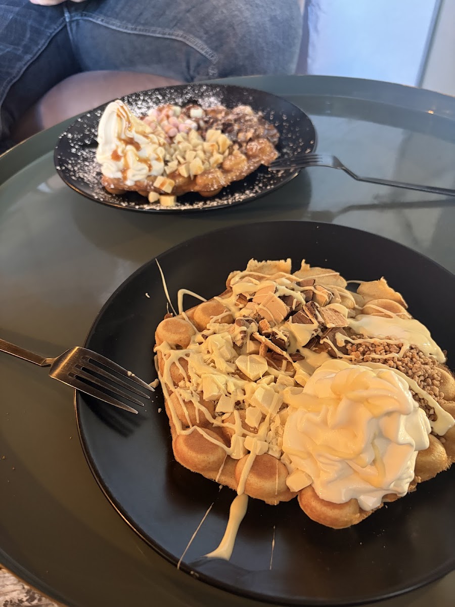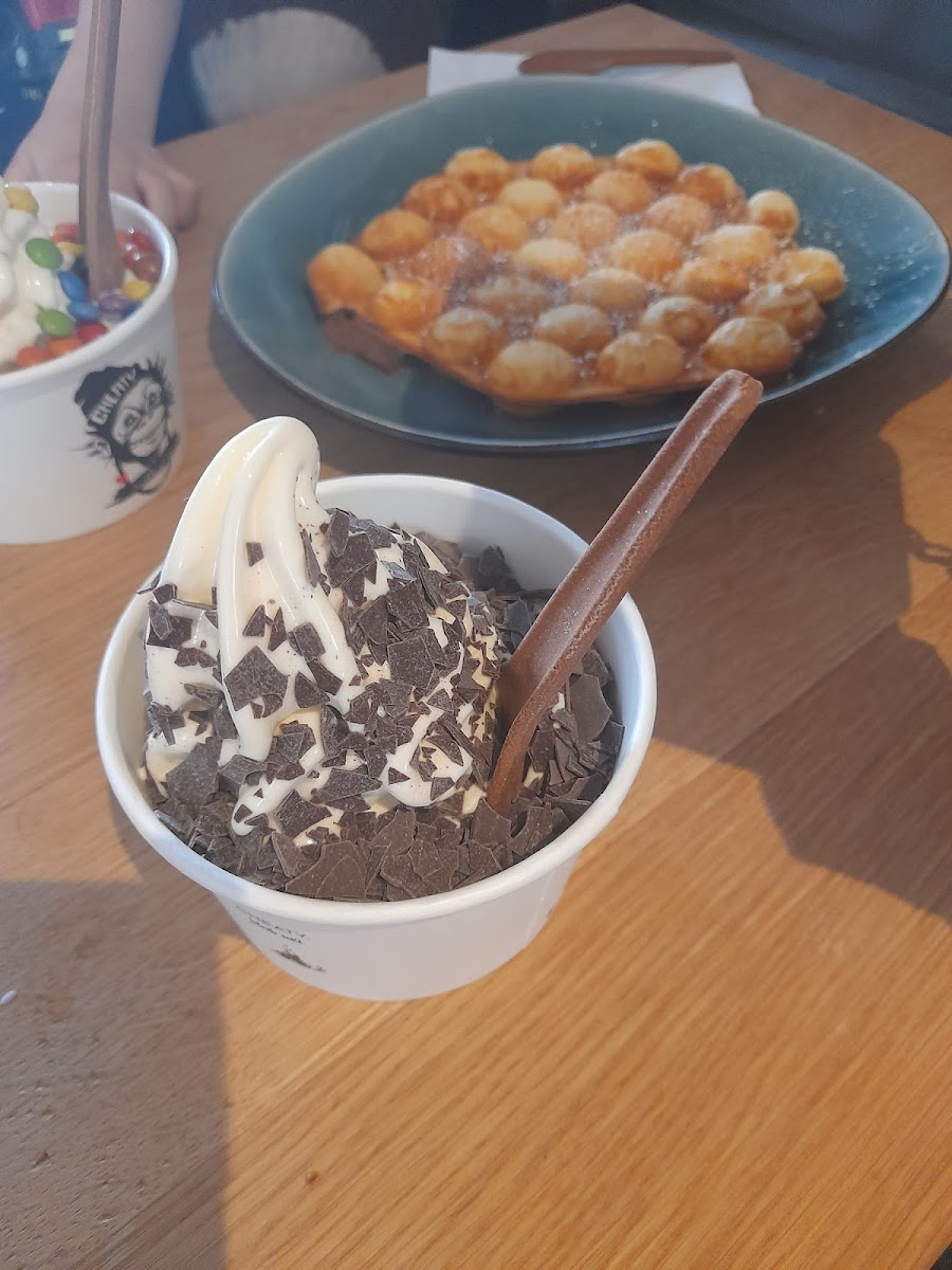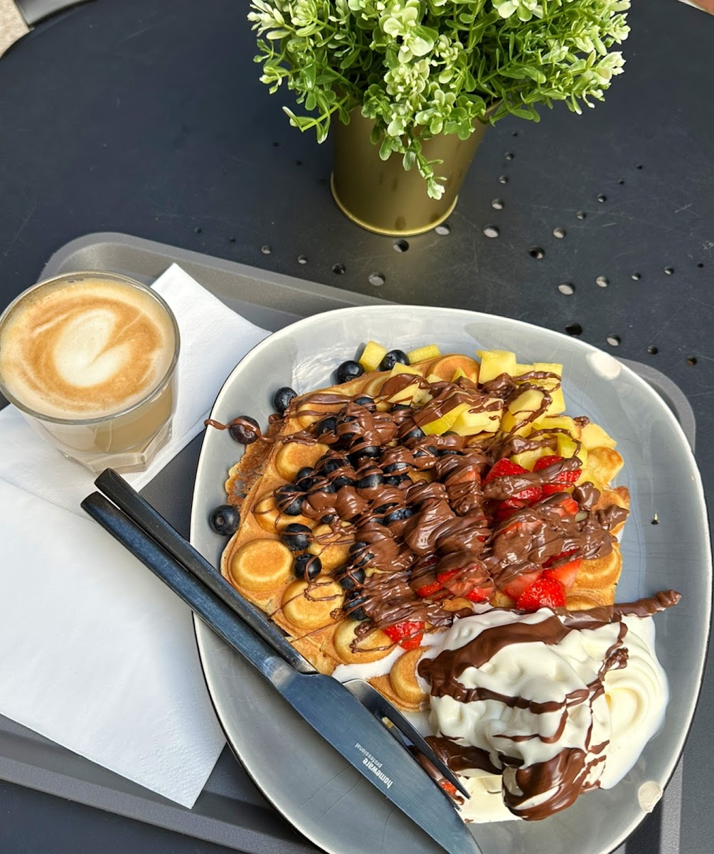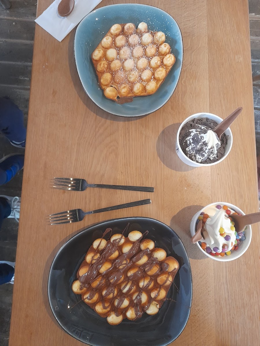 The café specializes in fresh, crispy waffles—bubble waffles in particular—that come with a generous selection of toppings, including classics like vanilla ice cream paired with Nutella sauce. The menu also highlights some inviting options like carrot cake and soft ice cream with chocolate chips, which draw a crowd looking for a comforting dessert or a satisfying afternoon pick-me-up.